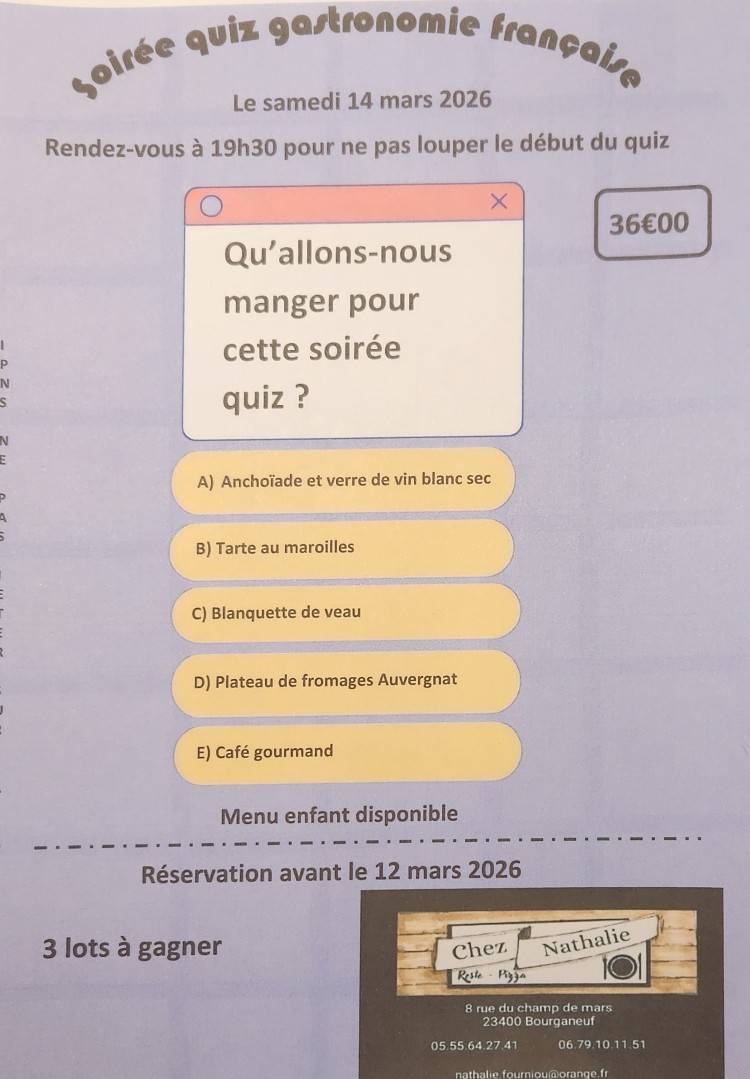 Nous vous informons que la soirée quiz dédiée à la gastronomie française prévue le samedi 14 mars à 19h30 chez Nathalie est malheureusement annulée.